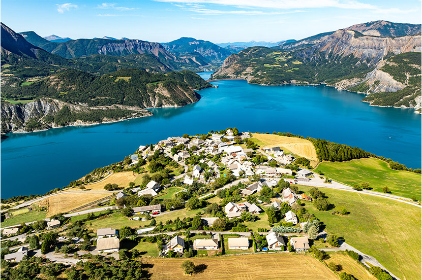 Un des panoramas les plus saisissants de Serre-Ponçon : depuis le Sauze-du-Lac, le lac se déploie dans toute sa grandeur, bordé par les montagnes et ponctué de criques sauvages.